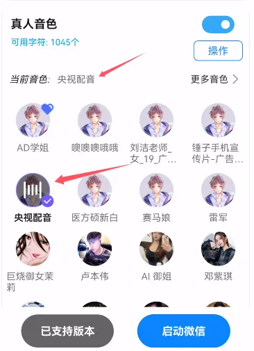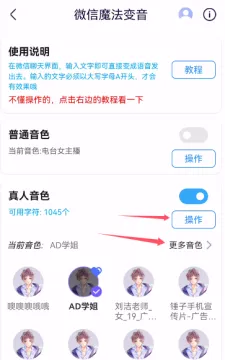 1、微信魔法变音页面,点击真人音色右侧的“操作”按钮,在弹出的对话框中点击“声音库”;或者直接点击“更多音色”按钮。