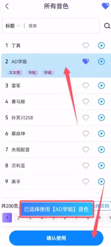 2、所有音色页面,可以搜索或翻页查找你喜欢的音色,可以点击试听或收藏,点击底部“确认使用”按钮,提示“已选择使用xxxx音色”即可。