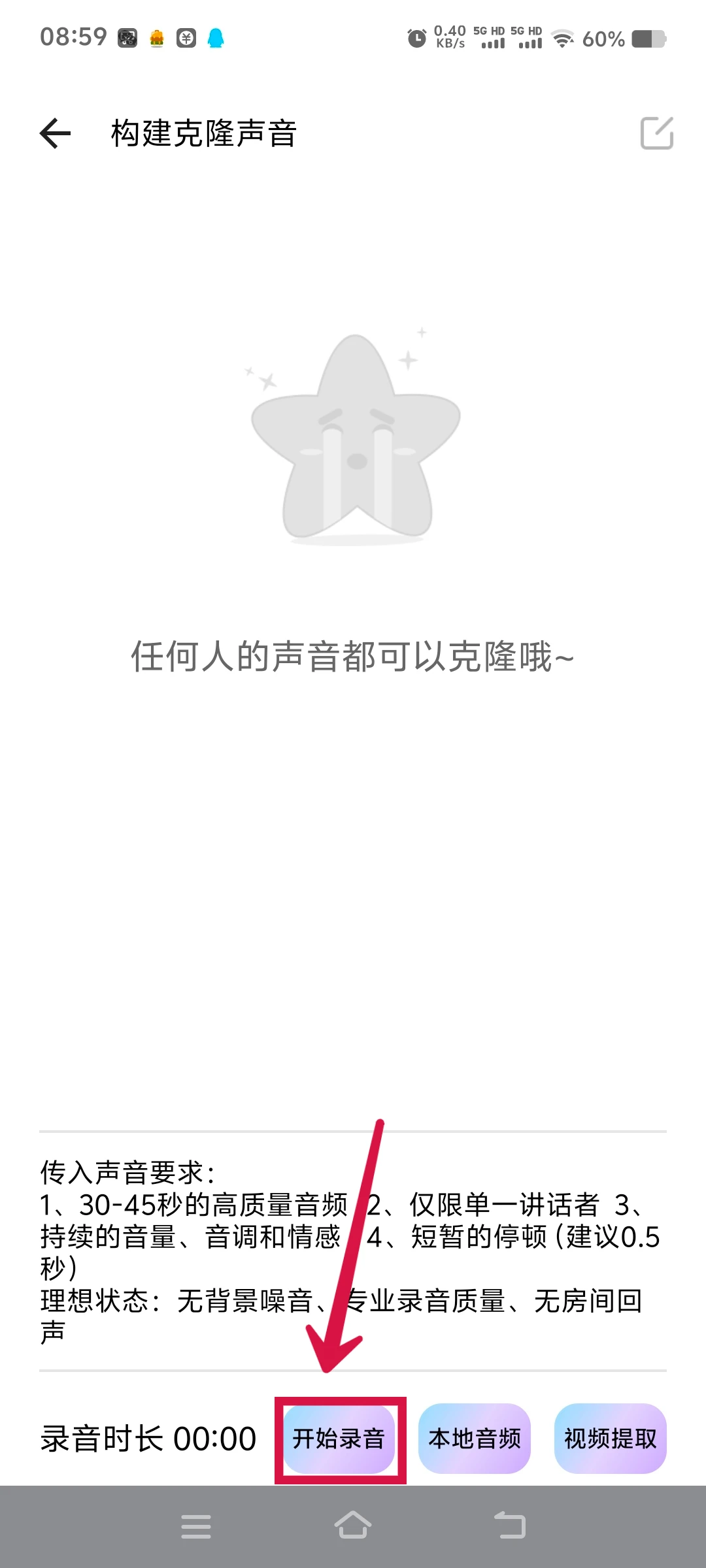 3、构建克隆声音页面,先看底部的传入声音要求,再点击底部的“开始录音”按钮