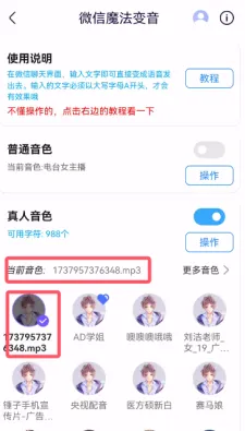 1、微信魔法变音页面,点击真人音色右侧“操作”按钮