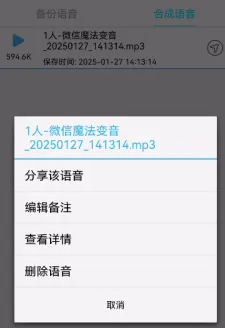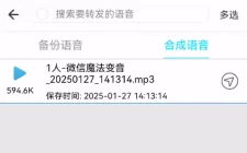 5. 查看合并结果:合并完成后,系统会自动跳转到合成语音列表页面。在这里,你可以单击一条音频进行试听,长按可编辑,点击查看详情,并记住位置或文件名。