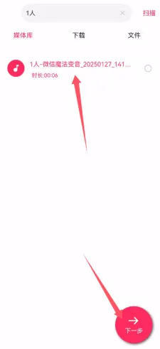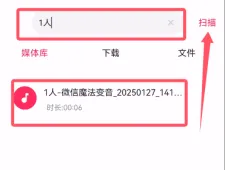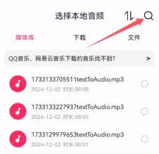 8. 搜索并选择音频:在本地音频页面,点击右上角的搜索按钮,输入刚才保存的文件名称,点击扫描按钮,找到并选择该音频。