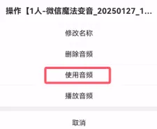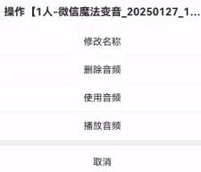 10. 编辑音频:在右上角可批量编辑,点击单条试听该音频,长按单条可修改名称、删除音频、使用音频、播放音频。