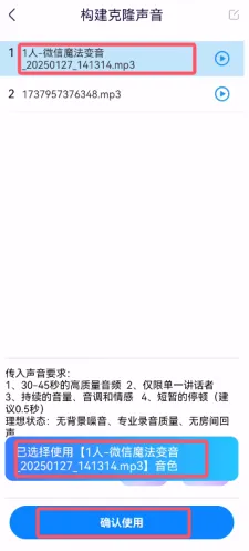 11. 确认使用:点击菜单中的“使用音频”,或者底部的“确认使用”按钮,你的克隆音色就准备好了。