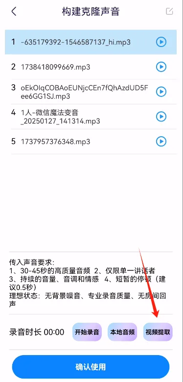 5. 视频提取按钮:点击底部的“视频提取”按钮,开始从视频中提取音色。