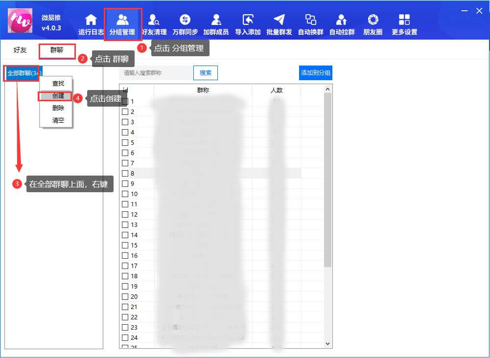 1、点击wetools功能界面上分组管理按钮,点击群聊,在左侧,全部群聊,上面鼠标右键,选择创建;