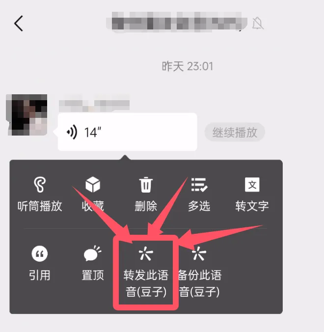 在豆子精灵的微信分身中,长按语音消息,弹出来的菜单中点击转发此语音即可。