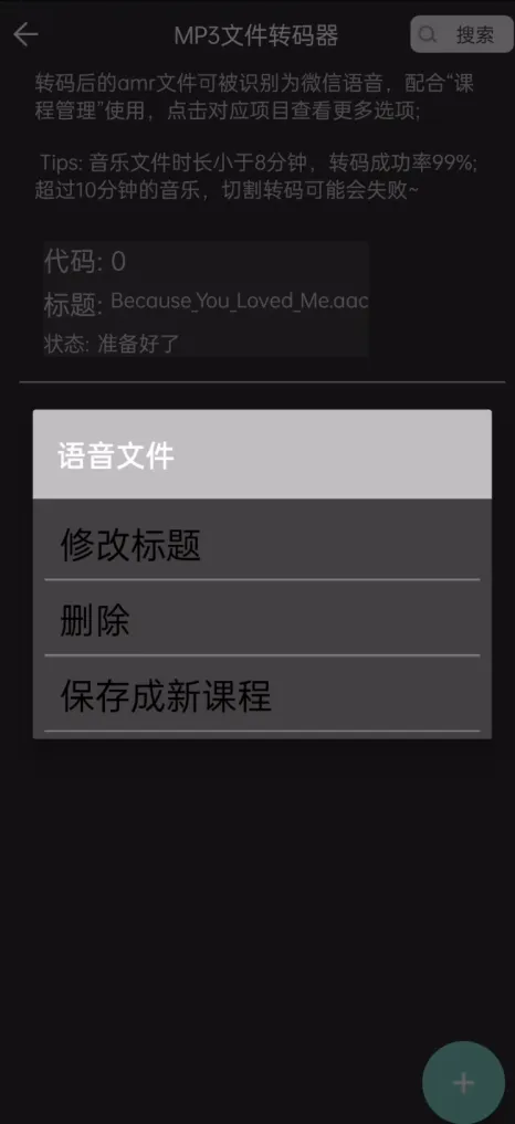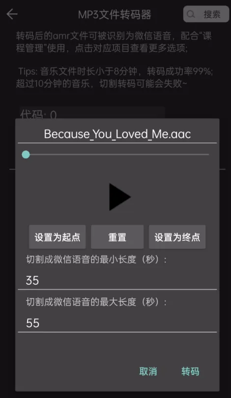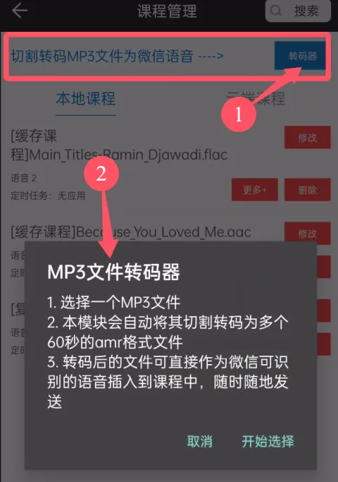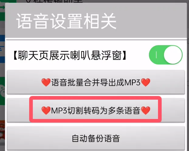3. MP3切割转码为多条语音,点击后会跳转到转码器,切割后的语音可以直接发送到微信中。