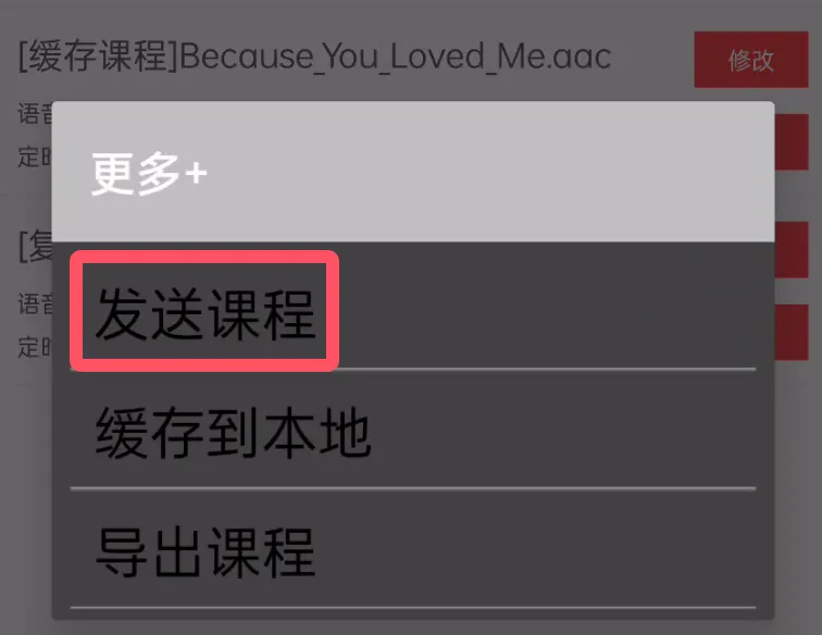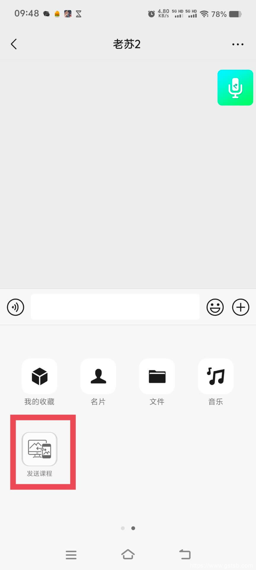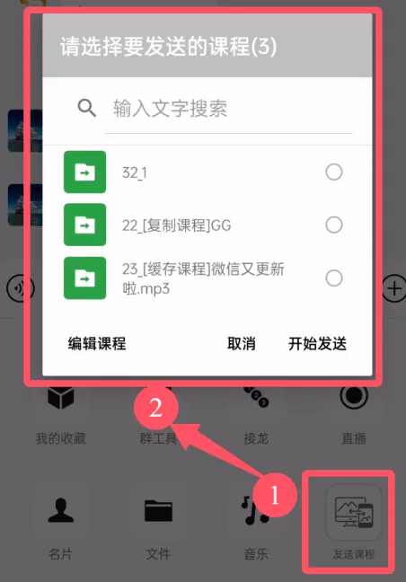或者在聊天窗口中点+号,选择“发送课程”按钮
