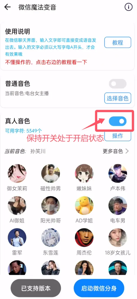 a.必须开启魔法变音的开关,微信分身中才有此功能(如下图所示)。